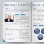 創業100年以上のしっかりとした雰囲気を保ちつつ、グラデーションや幾何学模様を背景にあしらい、若い方にも興味を持ってもらえるようにデザイン制作いたしました。| 目的 | 会社案内パンフレット |
