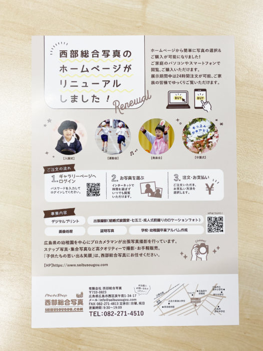 ホームページのリニューアル制作と共に、チラシのご注文をいただきました。今回のリニューアルで、ホームページ上で簡単に写真の閲覧・購入ができるようになったため、そのご案内チラシとなります。