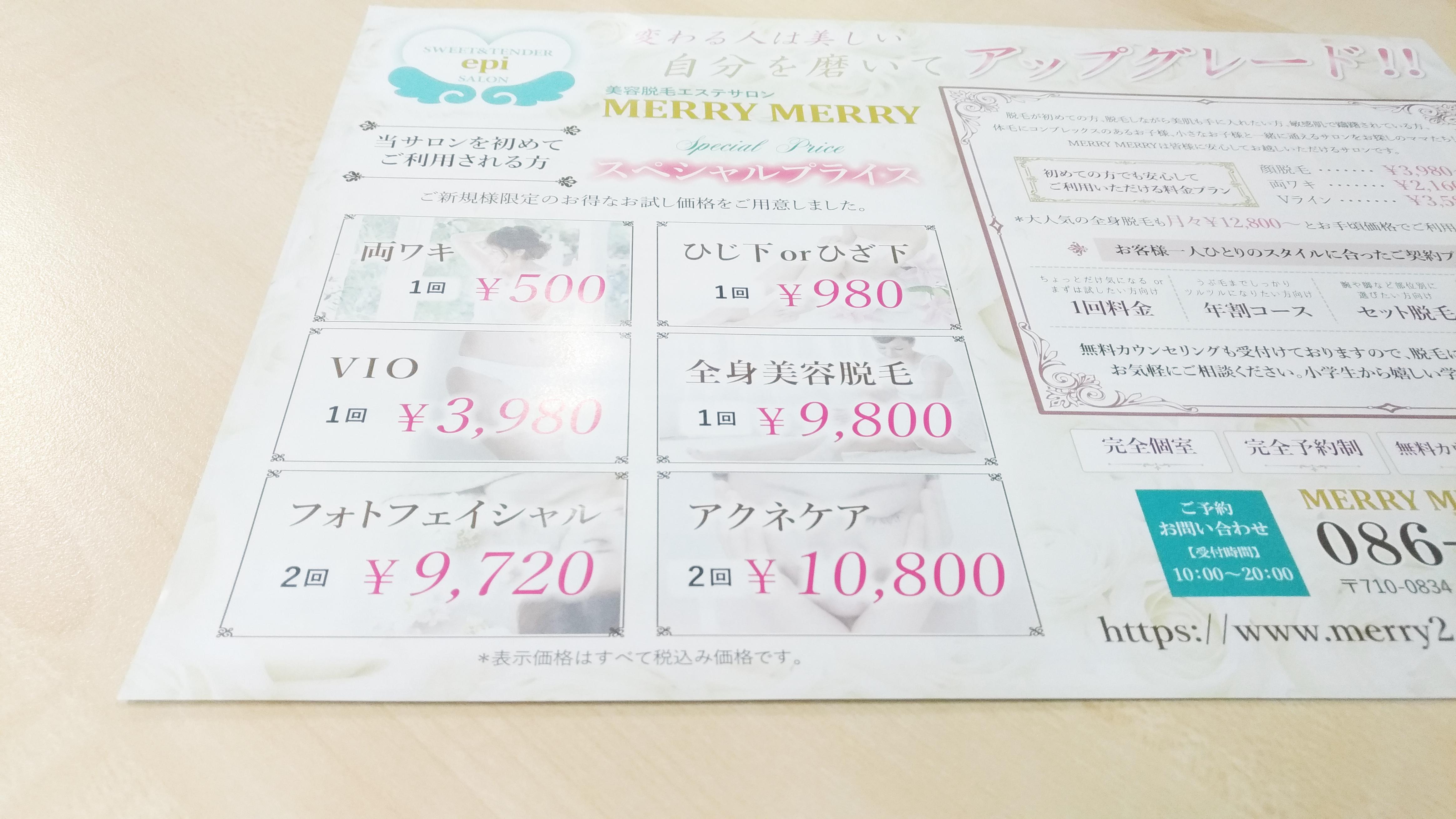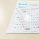 ●脱毛のプライスをエレガントな印象でイメージ付きで表現しました。裏面には上品な印象のコスメシリーズのデザインです。両面で印象が違うので打ち出しにインパクトがあります。